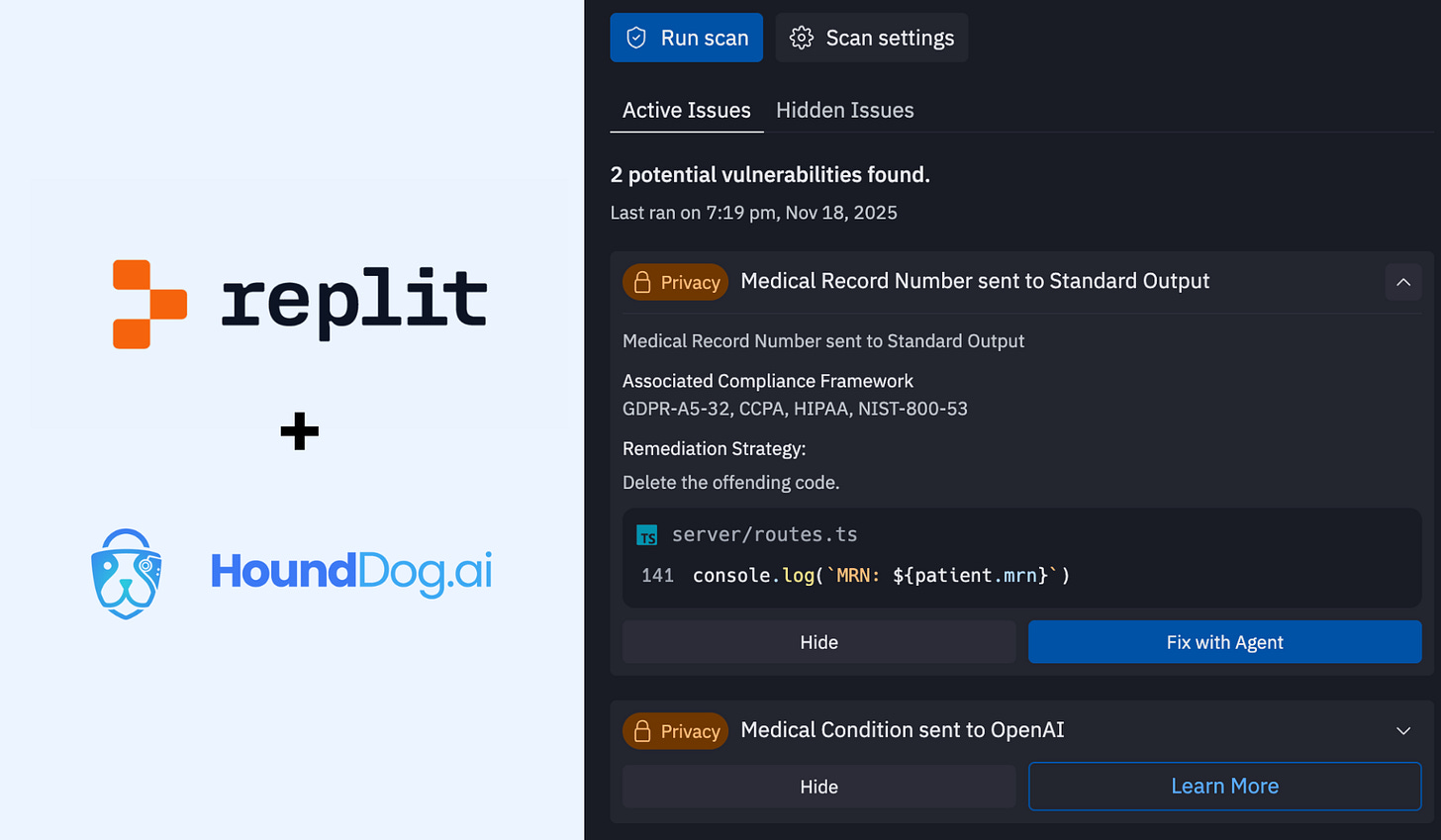 Replit, the AI app generation platform used by over 45M creators, has integrated the HoundDog.ai privacy code scanner to proactively check for potential privacy leaks. Try the privacy scanner in Replit or download it for free to generate a local markdown report with a sensitive data map, data flow visualizations, and data flow traces for detected privacy leaks.