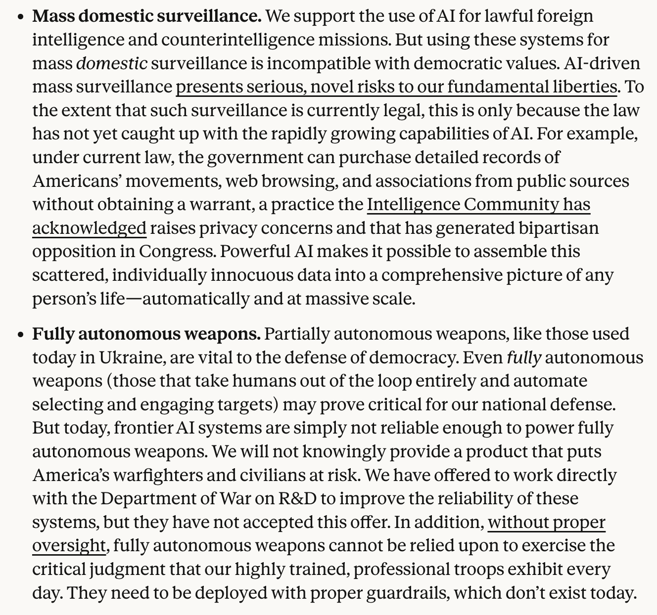 The main reasons he lists for why the company is against these forms of AI deployment are: