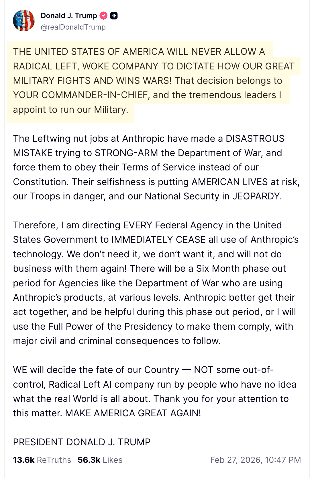 Lastly, Trump posted about Anthropic:
