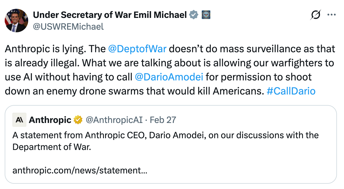 Emil Michael, the “Under Secretary of War,” quoted Anthropic’s blog post, saying that the company wanted the final word over military uses of AI:
