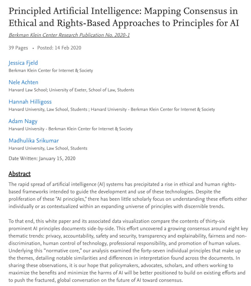 "Principled Artificial Intelligence: Mapping Consensus in Ethical and Rights-Based Approaches to Principles for AI" by Jessica Fjeld, Nele Achten, Hannah Hilligoss, Adam Christopher Nagy & Madhulika Srikumar. A map of current efforts to minimize harm and support human values, principles, and rights when dealing with AI. Download it for free here.
