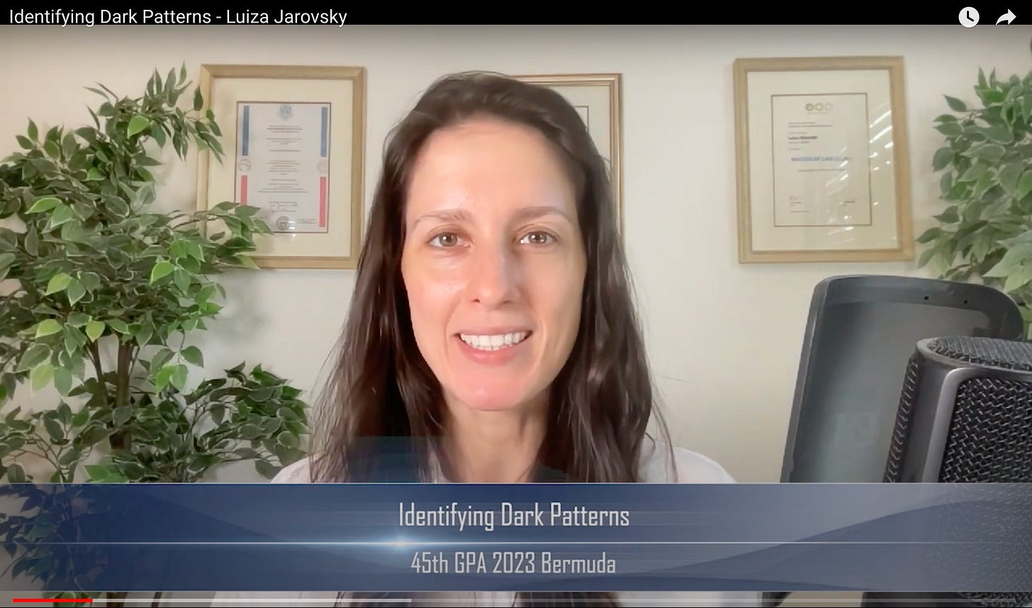 I was invited to give a lightning talk about 'Identifying Dark Patterns' at the 45th Global Privacy Assembly in Bermuda, where data protection & privacy commissioners from around the world met. Watch the 5-minute recording, and if you want to dive deeper into the topic, register for my upcoming Masterclass on Dark Patterns and Privacy User Experience on January 11 or book a group training session.