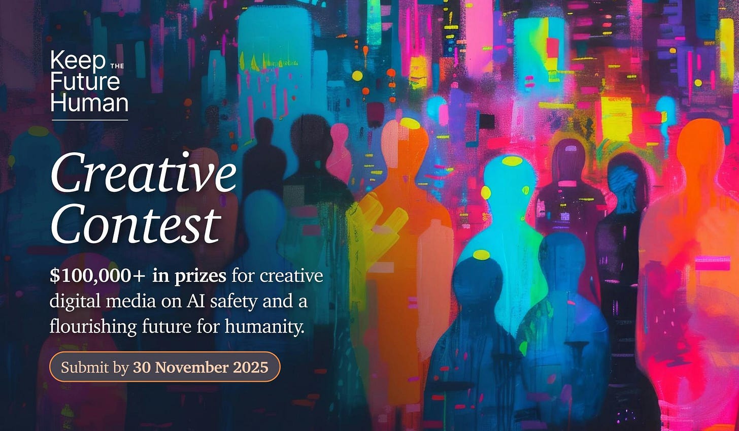 Announcing the “Keep the Future Human” creative contest! Over $100,000 in cash prizes for digital media on our human future with AI. Raise awareness of the risks of superintelligence and inspire real-world action. Learn more and enter by Nov 30.