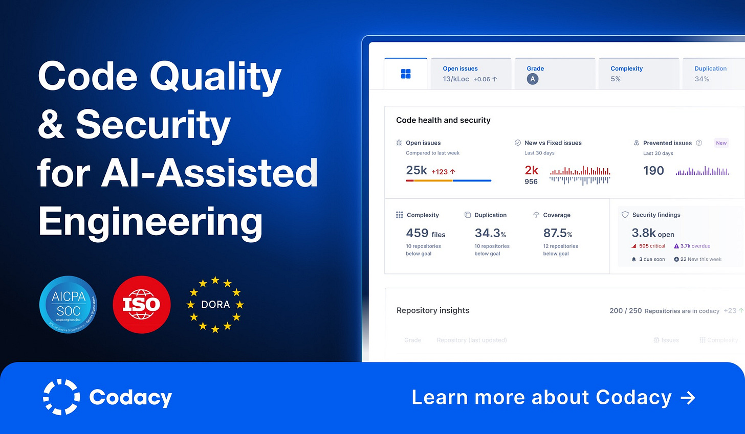 AI helps your developers ship fast, but it also scales risk. Codacy brings Code Quality, Security, and AI Coding Standards together in one unified platform. Build secure, compliant, and maintainable software without slowing down. Learn more about Codacy.